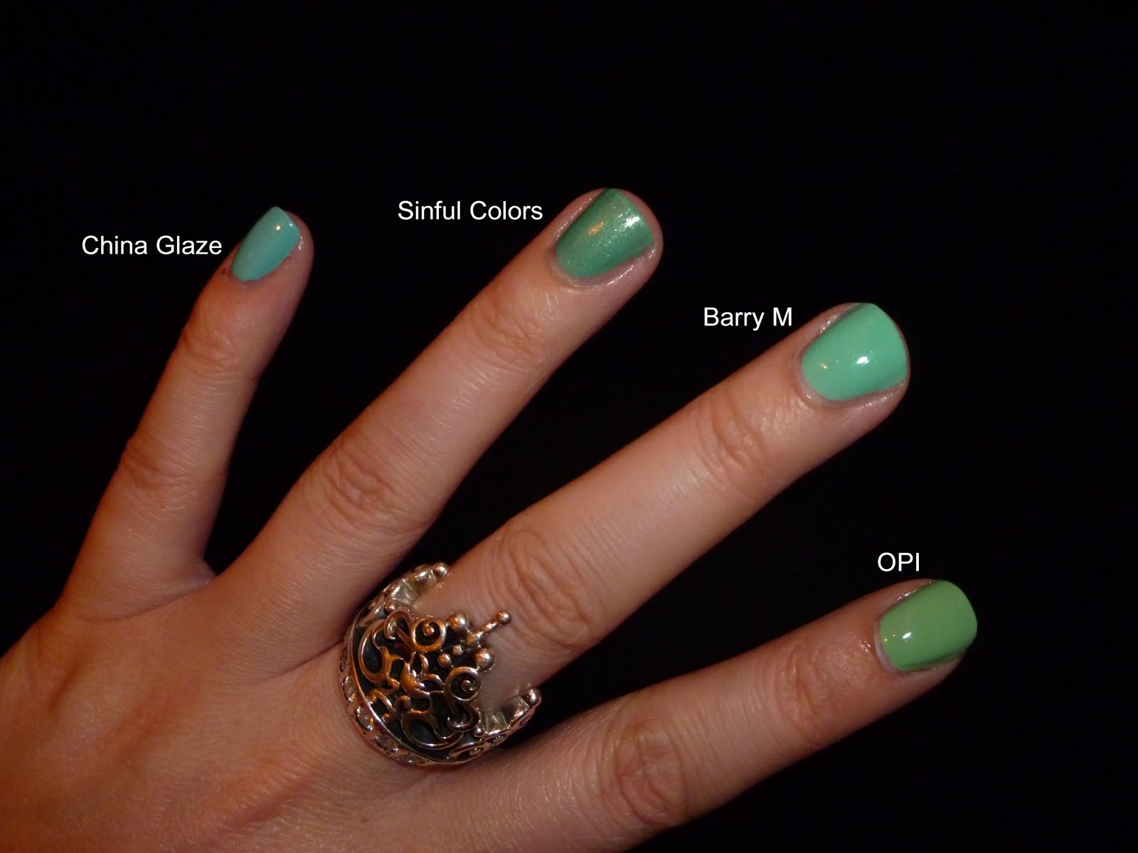 Just to show you my favorite minties I`ve used China Glaze - For Audrey (is it a green...or is it a blue..for me it`s a minty), Sinful Colors - Mint Apple, Barry M - Mint Green and ofc the lovely OPI one. Only Mint Apple has a slight shimmer, rest are cremes. Only a basecoat, 2 layers of each polish and a topcoat...hhmmm this actually looks funny. I wonder what they`ll say at work tomorrow ;)